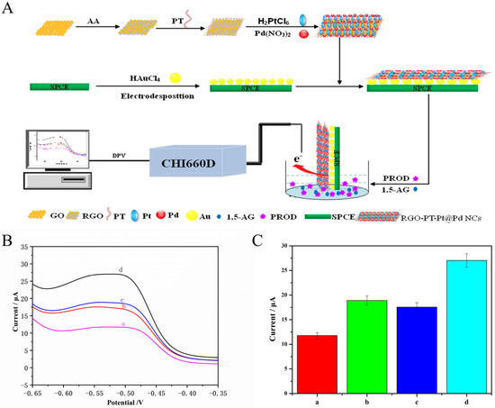 (A) Schematic diagram of an electrochemical sensor based on PT-rGO-PtPd NCs for 1,5-AG detection. (B) DPV maps of the feasibility of 1,5-AG detection performed by different electrochemical sensors in a PBS solution (0.1 mol/L; pH 7.0). (a) PT-rGO-PtPd NCs/Au NPs/SPCE, (b) 1,5-AG (0.1 mg/mL) /PT-rGO-PtPd NCs/Au NPs/SPCE, (c) PROD/PT-rGO-PtPd NCs/Au NPs/SPCE, (d) 1,5-AG (0.1 mg/mL)/PROD/PT-rGO-PtPd NCs/Au NPs/SPCE. (C) Histogram of the feasibility of electrochemical sensor for determining 1,5-AG. ((a) PT-rGO-PtPd NCs/Au NPs/SPCE, (b) 1,5-AG (0.1 mg/mL)/PT-rGO-PtPd NCs/Au NPs/SPCE, (c) PROD/PT-rGO-PtPd NCs/Au NPs/SPCE, (d) 1,5-AG (0.1 mg/mL)/PROD/PT-rGO-PtPd NCs/Au NPs/SPCE).