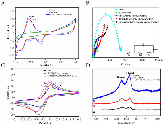 (A) The CV curves of (a) SPCE, (b) Au NPs/SPCE, and (c) PT-rGO-PtPd NCs/Au NPs/SPCE in PBS solution (0.1 mol/L, pH 7.0) in the presence of 100.0 μmol/L H2O2. (B) EIS and (C) CV curves of different electrodes ((a) SPCE, (b) Au NPs/SPCE, (c) PT-rGO-PtPd NCs/Au NPs/SPCE, (d) PROD/PT-rGO-PtPd NCs/Au NPs/SPCE, and (e) 1,5-AG/PROD/PT-rGO-PtPd NCs/Au NPs/SPCE) in PBS solution (0.1 mol/L, pH 7.0) containing 5.0 mmol/L K3Fe (CN)6/K4Fe (CN)6 and 0.1 mol/L KCl. (D) The Raman spectrum of different modified electrodes ((a) bare SPCE, (b) Au NPs/SPCE, and (c) PT-rGO-PtPd NCs/Au NP/SPCE).