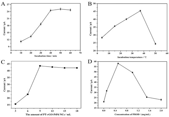 The optimization of experimental conditions. The effects of (A) different incubation times, (B) different incubation temperatures, (C) different amounts of PT-rGO-PtPd NCs, and (D) different concentrations of PROD on the response of the 1,5-AG biosensor were explored by the DPV method in PBS solution (0.1 mol/L, pH 7.0). The concentration of 1,5-AG in this experiment was set to 1.0 mg/mL. The error bars represent relative standard deviations (RSDs) (n = 3).