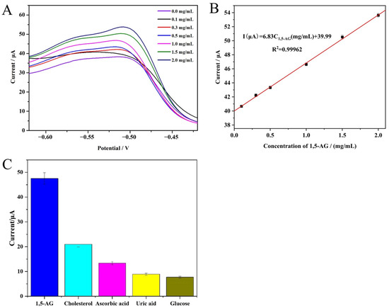 (A) The DPV plots of 1,5-AG at increasing concentrations from 0.1 to 2.0 mg/mL were obtained by using the 1,5-AG electrochemical biosensor. (B) The linear calibration curve of the electrochemical biosensor in the range of 0.1 to 2.0 mg/mL of 1,5-AG. (C) The histogram of the specificity of the proposed 1,5-AG electrochemical biosensor. The error bars represent the RSD (n = 3).