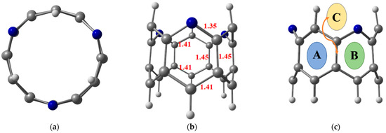 Top view (a) and side view (b) of the optimized structure of nanobelt at ωB97XD/6-311G(d,p) level of theory, where (c) presents the possible sites for doping transition metal atom; benzene ring (A), pyridine ring (B) and C—C bridge (C). Grey, whitish, and blue balls represent carbon, hydrogen, and nitrogen atoms, respectively.
