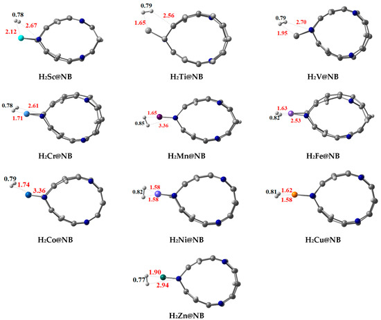 Optimized structures of stable hydrogen molecule-adsorbed TM@NB complexes (TM = Sc-Zn) at a ωB97XD/6-311G(d,p) level of theory.