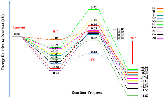 Hydrogen dissociation reaction pathway over TM@NB (TM = Sc-Zn) catalysts; all energy values are expressed in eV, and the energies of intermediate state (H2*), transition state (TS), and final state or products (2H*) are relative to the reactants.
