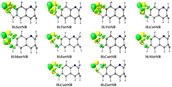EDD is performed to validate the NBO results, and the plotted EDD isosurfaces for the designed hydrogen-adsorbed TM@NB complexes are given in Figure 7. The green and yellow isosurfaces are seen in the EDD plots; this therefore corroborates the charge transfer upon hydrogen dissociation. Green colored isosurfaces present the accumulation of charge density, whereas the yellow colored isosurfaces are showing the depletion of charge density. From the EDD plots, it is obvious that a transfer of charge occurs from the transition metal (TM) to the hydrogen atom (H1), and from the hydrogen atom (H2) to nitrogen (N) upon hydrogen dissociation in all of the considered TM@NB complexes (for details, check Figure 7). In all TM@NB complexes, the yellow colored isosurfaces primarily appear over the TM atoms and hydrogen atoms interacting with the nitrogen atom of the molecular nanobelt presenting the depletion of charge density. Similarly, green colored patches appear over the hydrogen atom (H1) and the nitrogen atom of the nanobelt, displaying the accumulation of electronic charge density. Overall, the EDD results show a strong correlation with the results of the NBO charge transfer analysis. Additionally, the process of charge transfer facilitates the filling of electrons in the σ* (antibonding orbital) of the H2 molecule, hence making the dissociation process feasible over TM@NB catalysts.