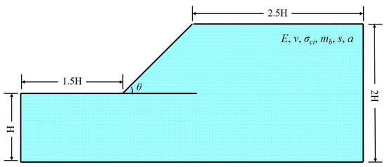 - A series of homogeneous slopes with different slope angles θ and weight γ were established by FLAC3D, and the geometric model is shown in Figure 2. The slope height H = 20 m remained unchanged, the variation range in slope angle was set to 30°–75° with a gradient of 15°, and the variation range of unit weight was set to 20–26 kN/m3 with a gradient of 2 kN/m3.