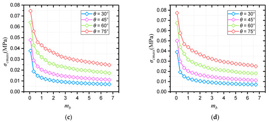 Critical Hoek–Brown strength curves of different slopes. (a) γ = 20 kN/m3; (b) γ = 22 kN/m3; (c) γ = 24 kN/m3; (d) γ = 26 kN/m3.