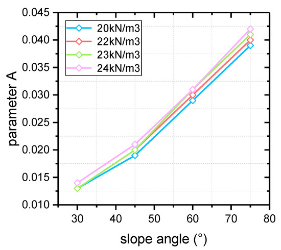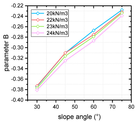 The fitting results and parameter values of each curve in Figure 3 are shown in Table 3, and the variation laws of each parameter are shown in Figure 4 and Figure 5. From the value of R2 corresponding to each curve, the fitting curves show good matching with the critical data, which explains the reliability of the fitting results to a certain extent. In addition, it is obvious that the fitting values of slope critical curve parameters A and B are roughly the same under different slope unit weight, with slight changes. The slope angle has a stronger influence on the critical curve parameters, both of which increase with slope inclination. Also, it can be seen from Figure 4 and Figure 5 that the values of parameters A and B are approximately linearly positively correlated with the slope angle.