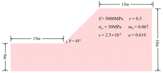 To verify the correctness of the Hoek–Brown criterion-based nonlinear reduction method proposed in this paper, it is necessary to employ the slope example whose safety factor has been confirmed for stability analysis. The built-in example in FLAC3D, simple slope in Hoek–Brown material, was selected and is shown in Figure 6. The uniformity of calculated safety factors of slope example by various methods in Table 4 explains that the calculation result by Hoek–Brown local linearization is relatively correct, which was therefore employed as the indicator to evaluate the efficacy of proposed method in this study.