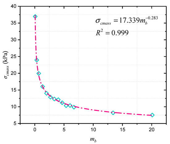 The same slope model was established by FLAC3D, and corresponding constitutive model and parameters were assigned. The slope strength was adjusted to reach the critical state so as to obtain the critical strength curve and its expression of this slope example. There are two methods to determine the critical strength curve expression of slope. One is to repeat the above operations to obtain a large number of data points about the critical parameters σcmass and mb, and to fit the critical strength curve expression of the model according to Equation (16). Secondly, the values of parameters A and B can also be theoretically obtained by solving the equations with only two sets of critical parameters σcmass and mb, approximately determining the critical curve expression. The latter is simple and less time-consuming, but curve accuracy cannot be guaranteed. For the sake of precision, the first method was used to obtain multiple sets of σcmass and mb, and the expression was fitted, as shown in Figure 7. Note that, the unit of σcmass is set as kPa to avoid gaining values too small for the parameters A and B by fitting.
