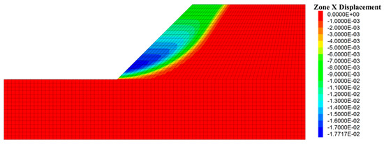 The calculation results show that during the range of mb (0, 25), the minimum Dexample approximates to 0.0267 when mbcritical is 0.0421, and the corresponding value of σcmasscritical is 42.4964 kPa. By substituting the critical values into Equation (18), ε = 0.6285 were obtained, which indicates that when σci and mb are reduced in each iterative calculation of slope stability numerical analysis, the reduction ratio remains 0.6285. Afterwards, the FLAC3D nonlinear reduction algorithm was customized by Fish language to solve the slope stability according to this reduction ratio, and the horizontal displacement is shown in Figure 8.
