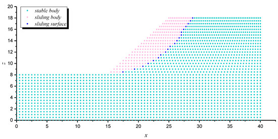 The coordinates and displacement data of each node in Figure 8 were derived and then imported into the MATLB calculation program. Then, the k-means clustering algorithm was used to classify these nodes according to the horizontal displacement differences, and corresponding nodes of sliding mass and stable mass were obtained, as shown in Figure 9. The nodes of sliding mass were isolated for analysis, and the rightmost nodes were considered the nodes on the potential sliding surface (dark blue nodes in Figure 9). The potential sliding surface of slope can be obtained by smoothing these nodes. According to the node coordinate information, the minimum principal stress of the node was derived from the FLAC3D slope model, and the calculated safety factor of the slope example is 1.314. Compared with the safety factor calculated by other methods in Table 3, the error is about 14.26%, which proves the correctness of this method to some extent. The reason for the 14.26% error can be attributed to the fact that the potential sliding surface is determined by node displacement, while the safety factor must be solved according to the nearby stress-state elements. That is to say, the calculated safety factor of the slope example is susceptible to the grid density of the model. The shear–stress calculation of nodes may make the safety factor by this method more accurate; however, it seems to be difficult to realize in finite element software.