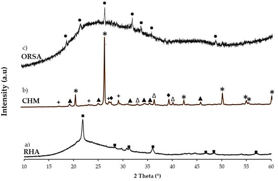 The RHA contains a high proportion of silica, SiO2 (73.6 wt.%), with less than 2 wt.% of (K2O, P2O5, CaO and MgO). The waste has a high LOI content (20.8 wt.%), indicating a high amount of organic matter due to incomplete combustion of the biomass, rice husk [38]. The CHM residue has mainly a high SiO2 content (63.1 wt.%), with significant additional contents of Al2O3 (12.1 wt.%), CaO (8.7 wt.%) as well as Fe2O3 (4.7 wt.%). The ORSA residue is mainly composed of Al2O3 (53.6 wt.%) and P2O5 (27.3 wt.%), with minor contents of Na2O (6.3 wt.%) and SiO2 (2.1 wt.%).
