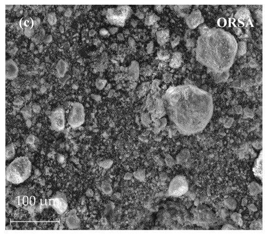 Figure 4 shows SEM images of the raw materials, RHA, CHM and ORSA. A wide particle size distribution is observed in all precursors, with micrometer-sized particles as well as some larger ones. Most of the RHA and CHM particles are irregular in shape with sharp edges and rough surface texture, with a smaller proportion of rounded particles. In contrast, ORSA has a higher proportion of rounded particles and a lower proportion of angular particles.