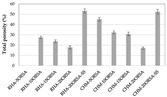 The true density of RHA, CHM and ORSA is 2120 kg/m3, 2721 kg/cm3 and 2566 kg/m3, respectively; therefore, these data indicate the formation of more compact structures when RHA is used as a precursor. The total porosity data after 28 days of curing (Figure 5) indicate a decrease in this property with the addition of ORSA, obtaining similar values of total porosity for the RHA-20ORSA and CHM-20ORSA samples of approximately 17.0%, indicating a higher fraction of closed porosity in the samples using RHA as a precursor. The l/s ratio used for both precursors is similar, with values of 1.55 and 1.45 for geopolymers using RHA and CHM, respectively. The higher porosity of CHM-xORSA cements could be due to a major excess of liquid in the mixture using the CHM precursor, due to the lower amount of water to acquire adequate consistency and workability, that escapes to the environment during the early stages of the curing process [43].