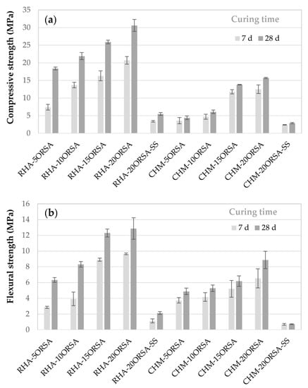 Flexural and compressive strength testing was conducted to evaluate the influence of ORSA content on the mechanical performance of RHA- and CHM-based geopolymers (Figure 6). The results of the mechanical tests indicate that the incorporation of increasing amounts of ORSA to the RHA and CHM precursors using an alternative activating solution produced an increase in these mechanical properties, obtaining optimum flexural strength values of 8.9 MPa and 12.9 MPa and compressive strength of 15.7 MPa and 30.6 MPa, for the CHM-20ORSA and RHA-20ORSA AACs after 28 days of curing, respectively.