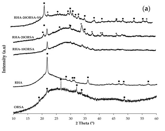 The addition of ORSA (5–20 wt.%) as a source of aluminum to silicon-rich sources such as RHA or CHM was studied in order to obtain binary alkaline activation cements.