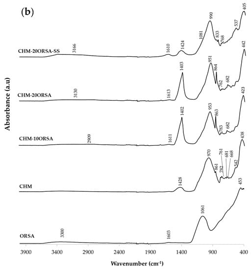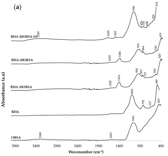 The FTIR spectra of the selected RHA-xORSA and CHM-xORSA geopolymers using the alternative activating solution and the commercial solution after 28 days of curing are shown in Figure 8. The FTIR spectra of the precursors are included for comparison. In the FTIR spectra of the ORSA, RHA and CHM residue, an absorption band is identified at approximately 1061, 1063 and 970 cm−1, respectively, which is associated with asymmetric stretching vibrations of the T-O-Si bond (T = Al or Si) typical of aluminosilicate species [52]. Another significant absorption band appearing in the three residues around 453, 449 and 446 cm−1 is related to O-Si-O bending [53]. In the RHA precursor, bands centered at 792 and 617 cm−1 are also observed; the former is due to the stretching vibrations of the Si-O bonds, characteristic of amorphous silica [54]. The band identified at 617 cm−1 may be related to the cristobalite phase [55]. In the CHM residue, we observe bands centered at 782 and 763, 681 and 668 and 542 cm−1 assigned to the Al-O stretching vibration, Si-O-Si symmetric stretching vibration and Si-O-Al deformation vibration, respectively [56,57]. In addition, centered bands are observed at 1428 and 861 cm−1, suggesting the presence of O-C-O bonds of CO32− groups associated with carbonate phases. In CHM and in the ORSA residue, absorption bands centered at 3345–3300 cm−1 and 1603 cm−1 assigned to O-H stretching and bending vibration are observed [58]. In the geopolymers using RHA and ORSA as a precursor, the band centered at 1063 cm−1 in RHA and at 1061 cm−1 in ORSA shifted in the range of 953–958 cm−1 after the samples reacted with the alternative alkaline solution, and up to 990 cm−1 when commercial sodium silicate is used. While in the geopolymers using CHM and ORSA, the band centered at 970 cm−1 in the residue shifts to 951–953 cm−1 when using the alternative solution and to 965 cm−1 when using commercial sodium silicate. When the SiO4 tetrahedron is partially substituted by the AlO4 tetrahedron during the hydration reaction, there is a change in the local chemical environment of the Si-O bond that explains the shift towards the low wavenumber, being more pronounced in the RHA-xORSA geopolymers. This shift suggests polycondensation of the bonds in the alkaline medium and the formation of an amorphous aluminosilicate gel [59], N-A-S-H gel in RHA-xORSA and N-A-S-H and (N, C)-A-S-H gel in CHM-xORSA geopolymers. An increase in the intensity of this band is observed as the ORSA content increases, which could indicate the formation of more aluminosilicate gels, in agreement with the compressive strength data for the geopolymers using the alternative activating solution. All geopolymers show absorption bands centered at 3150–2900 cm−1 and 1610–1620 cm−1 assigned to the stretching and bending vibrations of the O-H bonds, indicating that during the geopolymerization reaction, water was absorbed on the surface or trapped in the pores of the geopolymer. Another confirmation of the occurred geopolymerization can be found in the modification of the spectra in the range 600–800 cm−1 related to the Al-O-Si and Si-O-Si vibrations that are due to the formation of N-A-S-H and (N, C)-A-S-H gel [60]. In addition, centered bands at 1400–1425 cm−1 and 850–860 cm−1 are characteristic of CO32− assigned to C-O bending and stretching vibrations, respectively [61,62]. These bands reflect the formation of the sodium carbonate formed by atmospheric carbonation of unreacted NaOH and also CaO in CHM precursor [63], as these bands do not appear in the RHA and ORSA precursors and are less intense in the CHM precursor.