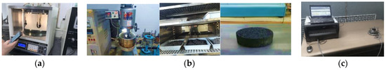 Illustration of laboratory test. (a) absolute viscosity; (b) Test specimen fabrication of Guss mastic asphalt mixtures; (c) Thermal conductivity test.