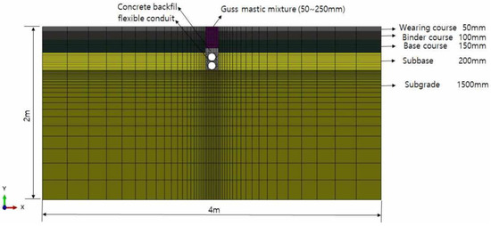 The finite element analysis model for pavement analysis was constructed in two dimensions for simple analysis, while each pavement layer and buried pipe were assumed to be a continuum [25,26]. The size of the analytical model is designed based on the suggestions from the Korean standard [5,28] and related research [25]. As shown in Figure 3, the size of the model was set to 4 m in length and 2 m in depth so that the heat transmitted by the heat source was trapped and did not affect the analysis [25,29]. Following the requirements in practice, the pavement structure was designed to have a thickness of 50 mm for the surface layer, 100 mm for the middle layer, 150 mm for the base layer, 200 mm for the subbase layer, and 1500 mm for the subgrade layer [30].