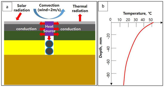 Figure 4a conceptually shows the initial and boundary conditions considered in the heat transfer analysis of this study. As for the initial conditions, the environment with the highest temperature of the pavement surface in the summer of the Republic of Korea was considered since this is the worst condition for the temperature of the high-temperature guss asphalt [25]. The initial temperature of the pavement, as shown in Figure 4b, was determined. The temperature at each depth was calculated using the Korean Pavement Design Method temperature analysis program under the condition of 2:00 pm in July in Seoul [19] (the time when the temperature of the surface layer is the highest).