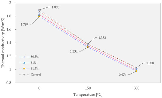 The thermal conductivity of guss mastic asphalt modified by different Sasobit content is presented in Figure 6 below. In general, the application of Sasobit slightly impacts the thermal conductivity of guss mastic asphalt. It may be attributed to the replacement of mastic asphalt binder by Sasobit, which obtains lower thermal resistivity compared to the former component. The effect of this additive is neglectable since the highest Sasobit content of 1.5% results in a thermal conductivity drop of 5.17, 3.54, and 5.25% compared to the control mixture at 0, 150, and 300 °C, respectively. Therefore, the Sasobit content is controlled at 1% to minimize the side impact on the guss mastic asphalt.