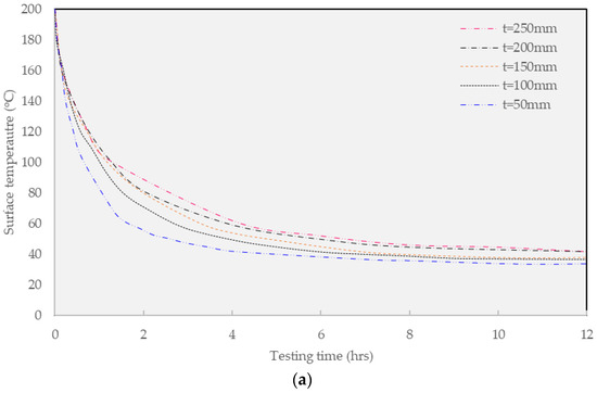 Figure 8a depicts the findings from the simulation of general HGA overlaying (200 °C). In general, the thickness of warm mix asphalt concrete noticeably contributes to the surface temperature of the layer. The higher thickness results in a greater required cooling time for traffic opening. When the thickness of the overlaying is 50 mm, the traffic opening time based on 40 °C criteria is 4 h 40 min after overlaying, while this value of 50 °C condition can be achieved after 2 h and 30 min. Further, this value of the 100 mm guss mastic asphalt layer concept is 7 h and 4 h in the former and latter constraints, respectively. Regarding the largest overlaying thickness of 250 mm, the required traffic opening time at 40 °C is up to 12 h 45 min, while the traffic opening time of the greater temperature 50 °C is 6 h and 40 min. This finding confirms the noticeable impact of thickness on the constituted thermal energy. Further investigation was performed on the warm mix asphalt.