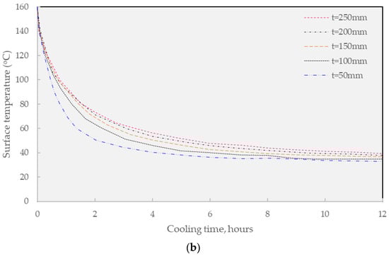 Figure 8b summarizes the result of the WGA overlaying concept (160 °C). In general, the findings share the equivalent trend as found in the HGA mixture since the shortened asphalt layer thickness greatly cultivates the drop in the required cooling time, especially, at t = 50mm. Considering the effectiveness of WGA, the results suggest that the application of this technique may contribute to the traffic operation benefit since this method requires a relatively shorter time compared to the conventional solution. In other words, the conventional method requires more than 4 h for the surface to cool to approximately 60 °C while the WGA only needs more than 3.5 h. Further investigating the thermal development in the warm guss mixture, when the thickness of the overlaying is 50 mm, the traffic open time based on 40 °C criteria is 4 h after overlaying, and this value of the 50 °C constraint is 2 h. Considering the overlaying thickness of 100 mm, the traffic opening time constrained on 40 °C is 6 h while the 50 °C condition requires nearly half that value of 3 h and 15 min after overlaying. Further investigation on the 150mm warm mix, the traffic opening time for the former and latter temperatures is 4 h and 5 min and 7 h and 40 min after overlaying, respectively. Especially, in view of the thickest overlaying layer of 250 mm, the allowable cooling time requires at least 10 h and 35 min and 5 h and 15 min for the 40 °C and 50 °C requirements, respectively.