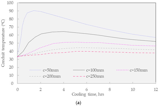 Figure 9a shows the impact of conventional HGA overlay on the designed covering thickness of backfill concrete. When the concrete cover is 250 mm, the maximum temperature at the top of the buried pipe rises to 39.6 °C, and it is confirmed that the maximum temperature used is within the standard of 60 °C [28]. Considering the backfill concrete cover of 150 mm, the measured temperature at this location was increased to 51.9 °C an acceptable value. However, when the concrete cover thickness is reduced to 100 mm, the maximum temperature at the top of the buried pipe rises to 64.1 °C which exceeds the maximum temperature limit of 60 °C for about 2 h and 20 min, thus this thickness option does not meet the standard. Finally, regarding the lowestconcrete cover thickness of 50 mm, the maximum temperature at the top of the buried pipe increased remarkably to 94.48 °C and surpassed the maximum temperature limit for a duration of about 9 h and 35 min, indicating the failure of this design. In general, the thickness of the concrete imposed a strong impact on the thermal value of the buried conduit.