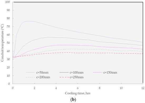 Figure 9b presents the result of WGA overlaying on the designed thickness of backfill concrete for the conduit system. In general, the application of warm mix asphalt enhances the thermal durability of the buried conduit since this solution requires lower construction heat. Regarding the first, when the thickness concrete cover is 250 mm, the maximum temperature at the top of the buried pipe rises to 38.3 °C, which confirmed that the maximum temperature for use is within the standard that is lower than 60 °C. In addition to the largest thickness option, the selection of 100 mm covers thickness results in the maximum temperature at the top of the buried pipe of 57.1 °C which is very close to the standard. Finally, the shortest solution of 50 mm also suffered from the overwhelming temperature in the buried conduit since the measured temperature was 76.8 °C which last for about 7 h and 25 min.