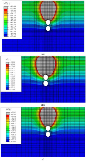 As shown in Figure 5a, the temperature at the surface of the overlaying was checked at each increment to investigate whether the overlaying of the guss asphalt mixture fell below the traffic opening temperature in a required interval. In addition, as shown in Figure 5b, the temperature was also recorded at each time increment at the top of the pipe, which is closest to the heat source, to check whether the buried pipe rose above the operating temperature [29,39].