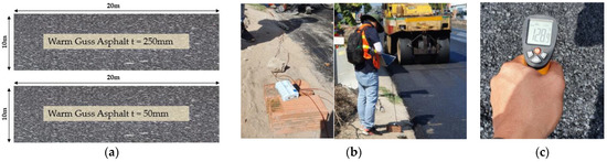 The field construction was performed in the South of Vietnam, in the Mekong delta region. The testbed section was designed in 40 m long sections involving 2 different conditions, WGA having a thickness of 250 mm and 50 mm, respectively. The ambient temperature was around 30 ± 3 °C on the testing day and the humidity is greater than 80%. Considering the mix design of the full-scale testbed, the pilot trenches were overlayed by the equivalent mix design used in the laboratory works. The measurement of the asphalt temperature in the field is presented in Figure 11. The following comparison was developed from the recent field test to verify the FEM modeling of the trench covered by WGA.