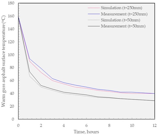 Korean asphalt mixture production and construction guidelines [19] require that traffic can be opened when the surface temperature of the pavement is less than 40 °C after asphalt maintenance (or overlaying), and traffic can even be operated at less than 50 °C when the supervisor’s approval is also accepted in some areas. Therefore, based on this requirement, the analysis results of WGA overlaying and HGA overlaying were examined.