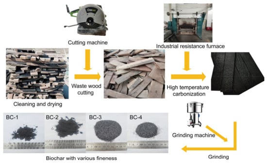 In this study, we chose waste wood as a raw material for the preparation of BC. First, the collected four kinds of raw materials were dried and put into a sealed container and then put it into a muffle furnace, heated to 500 °C for cracking at a heating rate of 20 °C/min under anoxic conditions, and kept at a constant temperature for 2 h to completely carbonize them. The BC obtained by pyrolysis at high temperatures was naturally cooled to room temperature. Then, it was removed from the muffle furnace and crushed with a pulverizer for 20 s, 30 s, 1 min, and 2 min, respectively, to obtain four kinds of BC with different fineness levels, which were placed in sealed bags for later use. The specific production process is shown in Figure 1.