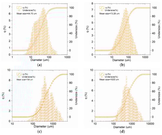 The fineness distribution of BC; (a) BC-1, (b) BC-2, (c) BC-3, and (d) BC-4.