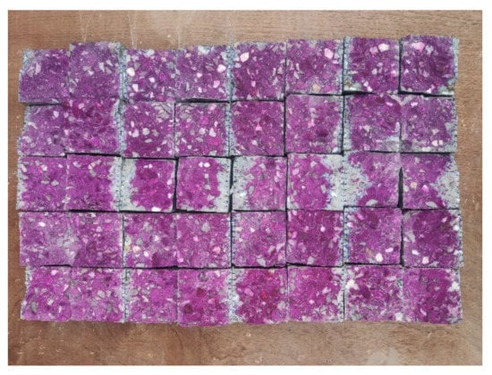 According to GB/t 50082-2009 [], the carbonation depth of concrete specimens was tested. Concrete specimens were subjected to standard curing for 28 days and then placed in a carbonation box, with minimum spacing of 50 mm between each specimen. The carbonation box environment was maintained per the following conditions: 20 ± 3% carbon dioxide concentration, 20 ± 5 °C temperature, and 70 ± 5% humidity. After seven and 28 days of carbonation curing, the specimens were removed and split from the middle of the specimen, and phenolphthalein test solution was applied to the section of the specimen to determine the carbonation depth, as shown in Figure 3.