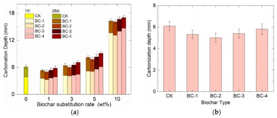Figure 4 shows the different trends in the rapid carbonation depth of biochar concrete with biochar dosage and fineness. At low biochar dosages (<3 wt%), biochar had an inhibitory effect on the rapid carbonation reaction of concrete. The most significant effect was observed at the 1% biochar dosage, with which the 28-day carbonation depth of biochar concrete with four different fineness levels (BC-1, BC-2, BC-3, and BC-4, ranging from fine to coarse) was reduced by 12.8%, 17.9%, 11.5%, and 4.6%, respectively, compared to CK. This outcome occurred because the pores of biochar can store water, which is released to reduce the water loss of the specimen during curing, thus maintaining the internal moisture of the concrete and promoting its full hydration and structural densification. Additionally, biochar can adsorb CO2 from the air, reducing the CO2 concentration on the concrete surface and delaying the carbonation reaction [,].