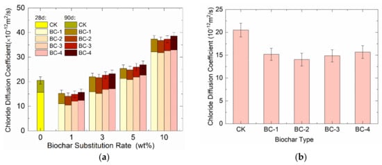 Figure 5b shows that the chloride diffusion coefficient of concrete first decreases and then increases with the increase in biochar fineness at the same dosage. When the biochar dosage was 1 wt%, the 90-day chloride diffusion coefficients of concrete with four different biochar fineness levels (BC-1, BC-2, BC-3 and BC-4) were 15.2, 14.04, 14.86 and 15.68 × 10−12 m2/s, respectively. This outcome indicates that BC-2 had a more significant effect on reducing the chloride diffusion coefficient of concrete than other fineness levels at dosages less than 1 wt% because coarse biochar particles absorb more water than fine biochar particles at the same water-cement ratio, resulting in a lower local water-cement ratio of concrete containing coarse biochar particles. Furthermore, coarse biochar particles release water at a later stage and create more capillary pores inside the concrete, increasing the permeability of the concrete and enhancing the chloride diffusion.