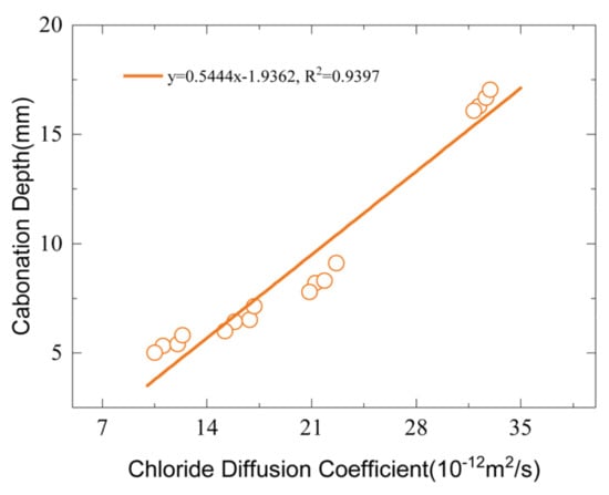 Figure 6 presents the relationship between carbonation depth and chloride diffusion coefficient for this study. It can be seen that there is a good relationship between different transport mechanisms, such as gas diffusion and ion diffusion. This relationship implies that carbonation and chloride ingress are coupled processes that affect each other’s rate and extent. Carbonation reduces the pH of concrete and decreases its chloride binding capacity, increasing the free chloride concentration and enhancing the chloride diffusion []. On the other hand, chloride ions can lower the carbonation depth by increasing the alkalinity of pore solution and inhibiting the dissolution of calcium hydroxide [,].