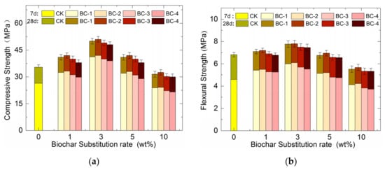 - The compressive and flexural strength of concrete increased and then decreased as the replacement rate of BC increases. When the content was less than 5%, the strength of biochar concrete was not lower than that of the control group. Of all the biochar fineness levels tested, BC-2 exhibited the most significant improvement in the strength of concrete.