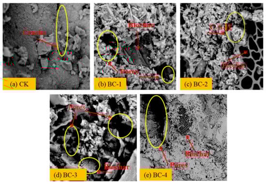 When BC-1 was added, although various hydration products interwoven into a dense and uniform structure were locally visible at the interface, biochar aggregated together due to van der Waals forces and could not play a cementing role to produce C-S-H crystals and other hydration products, forming larger pores and cracks around it. A small amount of flocculent C-S-H crystals were also scattered on the surface. These pores and cracks were the main reasons for the decrease in macroscopic mechanical properties of concrete specimens when excessive biochar was added (Figure 8b). When BC-2 was added, a large amount of fibrous AFt was visible on the entire surface of the cement paste interface and was evenly distributed with biochar. The added biochar was wrapped by hydration products and filled in the internal pores of the concrete, forming a continuous overall structure without larger pores or larger hydrated crystals (Figure 8c). When BC-3 and BC-4 were added, due to their larger fineness levels, they increased the number of local pores and cracks around ITZs and also caused more pores and cracks inside cement paste bodies, resulting in adverse effects, such as local stress concentrations, reduced effective bearing area, etc., leading to lower macroscopic mechanical properties of concrete (Figure 8d,e).