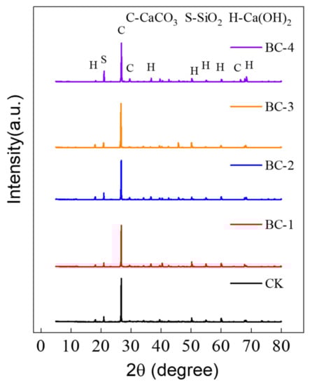 To further investigate the impact of biochar fineness on cement hydration, X-ray analysis was conducted on 28-day concrete specimens with a 3% biochar dosage. The main mineral composition of each group of specimens is presented in Figure 9. The concrete hydration products’ crystals with the most prominent diffraction peak intensities were CaCO3, SiO2, and Ca(OH)2. Their characteristic peaks changed with variations in biochar fineness. As the biochar fineness decreased, the intensity of CaCO3 diffraction gradually decreased, while the intensity of SiO2 and Ca(OH)2 diffraction initially decreased and then increased.