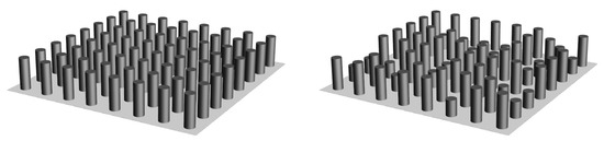 We consider an array of N pillars placed at nodes of a square substrate that transfers stresses resulting from loads felt by the pillars, see Figure 1. Since a number of pillars encountered in such nanodevices as, e.g., nanogenerators is of the order of – [9,15,16], for illustration purposes we choose .
