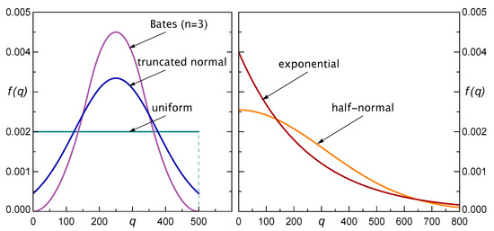 We will distinguish five illustrative distributions : uniform, Bates distribution for , truncated normal, half-normal, and exponential ones. Their parameters were chosen so that the mean value of the single step was the same. In this regard, we present the results for five cases where . Figure 4 shows these distributions sketched for .