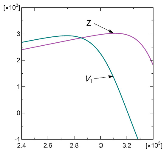 Let us assume that the load steps are distributed according to uniform distribution defined on the interval . In this case, the function (from Proposition) cannot be obtained explicitly, but its values can be determined numerically, and it can be verified that the condition Equation (4) holds. The function along with the payoff Z are presented in Figure 5.