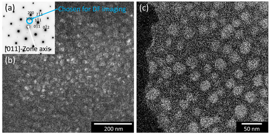 The structure of the larger spots in the diffraction pattern in Figure 2a demonstrates a (011) zone axis of a face-centered cubic (FCC) crystal structure arising from the matrix. Less pronounced superstructure diffraction spots can be identified between the large diffraction spots, indicating the presence of a second, ordered cubic phase with an L12-structure. DF imaging in Figure 2b shows that they correspond to the precipitates, as the precipitates have a bright appearance. Furthermore, as shown in Figure 2c by EFTEM, these particles are enriched in Al.