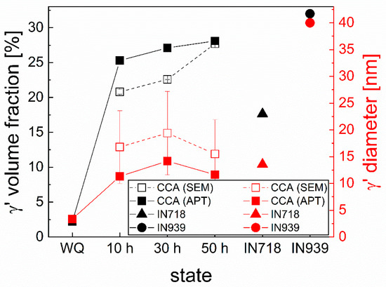 The comparison of the size and volume fraction of the CCA’s γ’ particles with the ones from IN718 and IN939 [23,24,25] in Figure 4 shows that the volume fraction of the γ’ phase is higher in the CCA than in IN718. However, it has to be mentioned that in IN718, there is an additional volume fraction of 11 vol.% of the γ’’ phase, which increases the overall precipitate volume fraction to 28.92 vol.%. That is comparable to the 28.1 vol.% precipitate volume fraction in the 50 h aged CCA. The volume fraction of γ’ in the IN939 alloy is 32 vol.%, which is already comparable to the 28.1 vol.% in the CCA. The γ’ size in the IN718, aged at a lower temperature than the CCA, is with 13.5 nm diameter in the same approximate range as in the CCA, whereas the secondary γ’ precipitates in IN939 [24] with approx. 40 nm are found to be substantially larger than the precipitates in the CCA at any considered aging time.