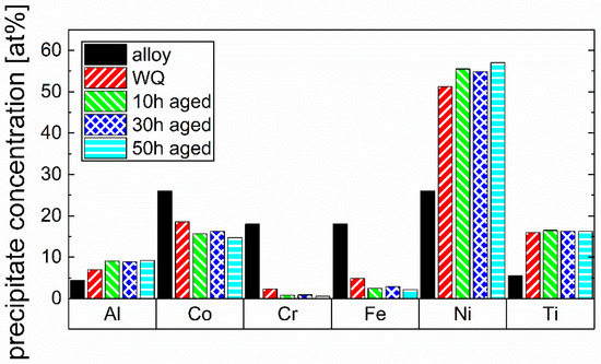 It reveals a depletion of Al (−1.9 at.%), Ti (−4.0 at.%), and Ni (−11.5 at.%) and an accumulation of Co (+4.8 at.%), Cr (+7.6 at.%), and Fe (+7.0 at.%) in the matrix phase of the 50 h aged alloy as compared to the overall alloy composition. All three aged states show a nearly constant content of all elements without significant changes, indicating a state close to the thermodynamic equilibrium at 750 °C. A different effect can be seen in the WQ state, indicating still a partly supersaturated condition in Al, Ti, and Ni. The Al concentration in the matrix of the WQ state is nearly as high as the concentration in the overall composition, whereas all other elements already change significantly but still do not achieve the composition of the aged states.