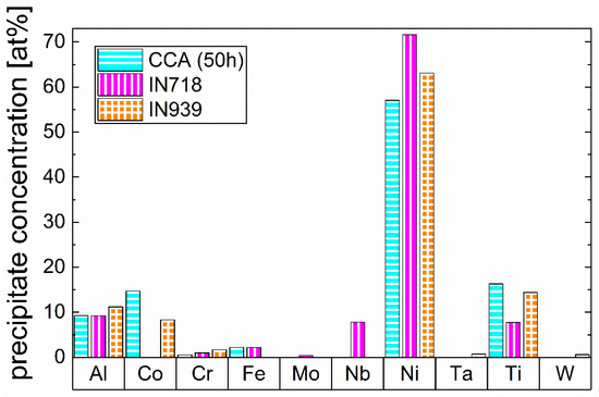 Comparison of the chemical composition of the precipitate phase of the CCA after 50 h of aging with the γ’-composition of Ni-based IN718 [20] and IN939 [21] alloys from the literature.