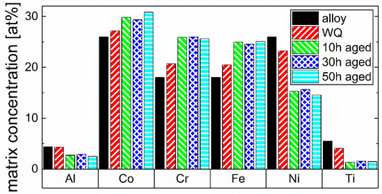 Comparison of the nominal alloy composition (alloy) with the chemical compositions of the matrix phase in the WQ and the three aged states (all after homogenization and annealing) of the CCA. A depletion of Al, Ti, and Ni and an accumulation of Co, Cr, and Fe can be seen in the matrix phase with aging.