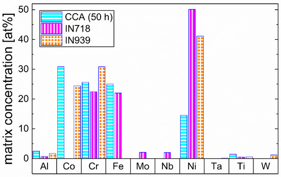 Furthermore, the matrix composition of the respective alloy in the 50 h aged state is compared to the matrix compositions of IN718 [20] and IN939 [21] from the literature in Figure 8 to address the significant chemical differences of the matrix between the CCA and already conventionally used alloys. This is important to note, as these differences can affect the properties of the phase in the respective alloy.